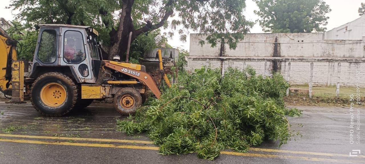 भीषण गर्मी से झुलस रहे नगर वासी व आस पास के गावो में दोपहर बाद अंधड़ चला व आधा घण्टा बारिश के बाद मौसम में ठंडक छाई। इसी दौरान कालकाजी मार्ग व जेल रोड पे बड़े वृक्ष धराशायी हुए जिसे नगर परिषद की आपदा प्रबंधन टीम ने हटाया।
