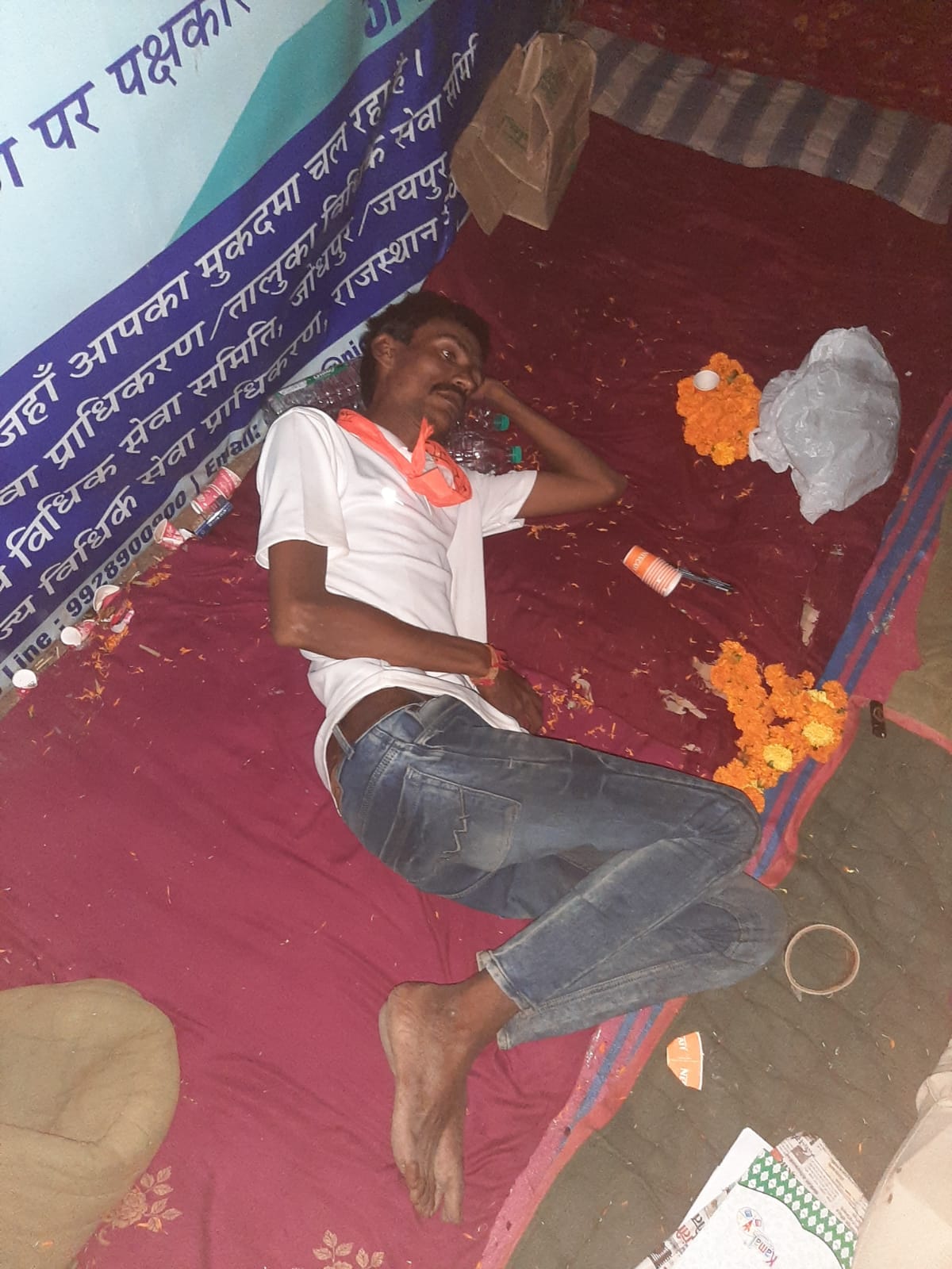 जिसमे मंगल कुमार मीणा,पृथ्वी राज सिंह, वीरेन्द्र सिंह सिदरठ,रितु किन्नर,,अशोक हरिजन,छगन रावल,नारायण देवासी भूख हड़ताल पे दूसरे दिन भी बैठे है।जिनके समर्थन में घुप्प अंधेरे में धरना स्थल पर समर्थन में गोभक्तकरण सिंह, मोहन बोराणा, धन सिंह, रमेश प्रजापत, गणेश मीणा, जितेंद्र सिंह परमार, विक्रम मीणा, हितेश कुमार, नारायण घांची, हिमांशु गहलोत, वाघाराम कुम्हार, मंछा राम, मुकेश कुमार, किशोर कुमार, प्रवीण माली मुकेश कुमार, सवा राम, ह्रितिक मीणा, छगन लाल, जितेंद्र कुमार, दीपक कुमार,समर्थन में जुटे हुए है व भूख के कारण छगन रावल ,अशोक कुमार हरिजन के स्वास्थ्य कमजोर होता जा रहा है।