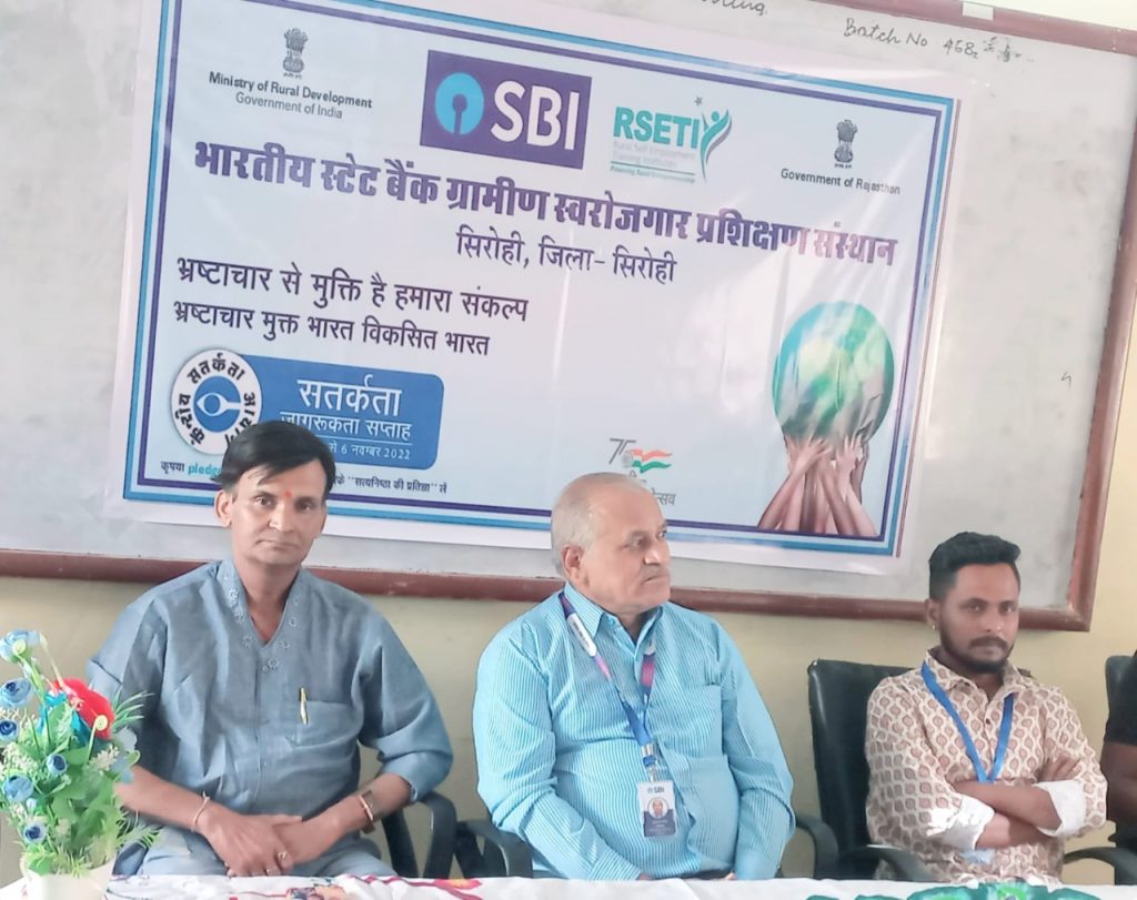 एसबीआई ग्रामीन स्वरोजगार प्रशिक्षण संस्थान (आरसेटी) के परिसर मे सतर्कता जागरूकता सप्ताह के अन्तर्गत कार्यक्रम का आयोजन किया गया ।जिसमे आरसेटी सिरोही निदेशक मूला राम राठौड़ ने प्रशिक्षण ले रहे समस्त प्रशिक्षणार्थियों को सम्बोधित करते हुये कहा कि आप सभी अपने व्यक्तिगत जीवन मे पूर्ण ईमानदारी के साथ अपने लक्ष्य को हासिल करे , जहां भी आपको भ्रष्टाचार दिखता है , वहाँ पर विरोध जरूर करे , हो सके तो संबन्धित के खिलाफ एसीबी मे अपील भी कर सकते है । गलत को गलत और सही को सही कहने की हिम्मत हम सब मे होनी चाहिए । आरसेटी अनुदेशक अजय कुमार रावत ने कहा कि गलत का विरोध न करने वाला भी गलत करने वाले के बराबर होता है । आज देश मे भ्रष्टाचार , देश के विकास मे बाधा उत्पन्न कर रहा है । जिसे हम सबको मिलकर इसे खत्म करना है ।प्रशिक्षणार्थियों ने भी कार्यक्रम मे अपने विचार व्यक्त किये , प्रशिक्षणार्थियों को कार्यक्रम मे निदेशक द्वारा पुरस्कार प्रदान किया गया ।