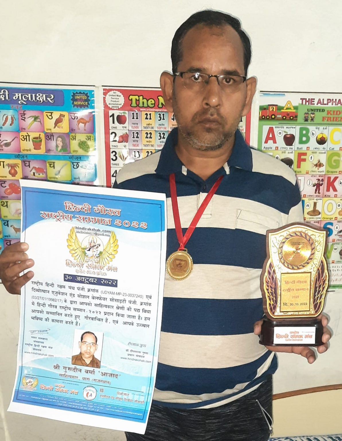 प्रसिद्ध साहित्यकार एवं शिक्षक गुरुदीन वर्मा को राष्ट्रीय हिन्दी रक्षक मंच , इंदौर द्वारा हिन्दी गौरव राष्ट्रीय सम्मान 2022 से सम्मानित किया गया है। साहित्यकार वर्मा ने बताया कि उनको यह सम्मान राष्ट्रीय हिन्दी रक्षक मंच एवं दिव्योत्थान एजुकेशन एंड वेलफेयर सोसायटी के संयुक्त तत्वावधान में 30 अक्टूबर 2022 को इंदौर में आयोजित सम्मान समारोह में प्रदान किया गया है। यह सम्मान उनको साहित्यकार श्रेणी की पद्य विधा में मिला है।