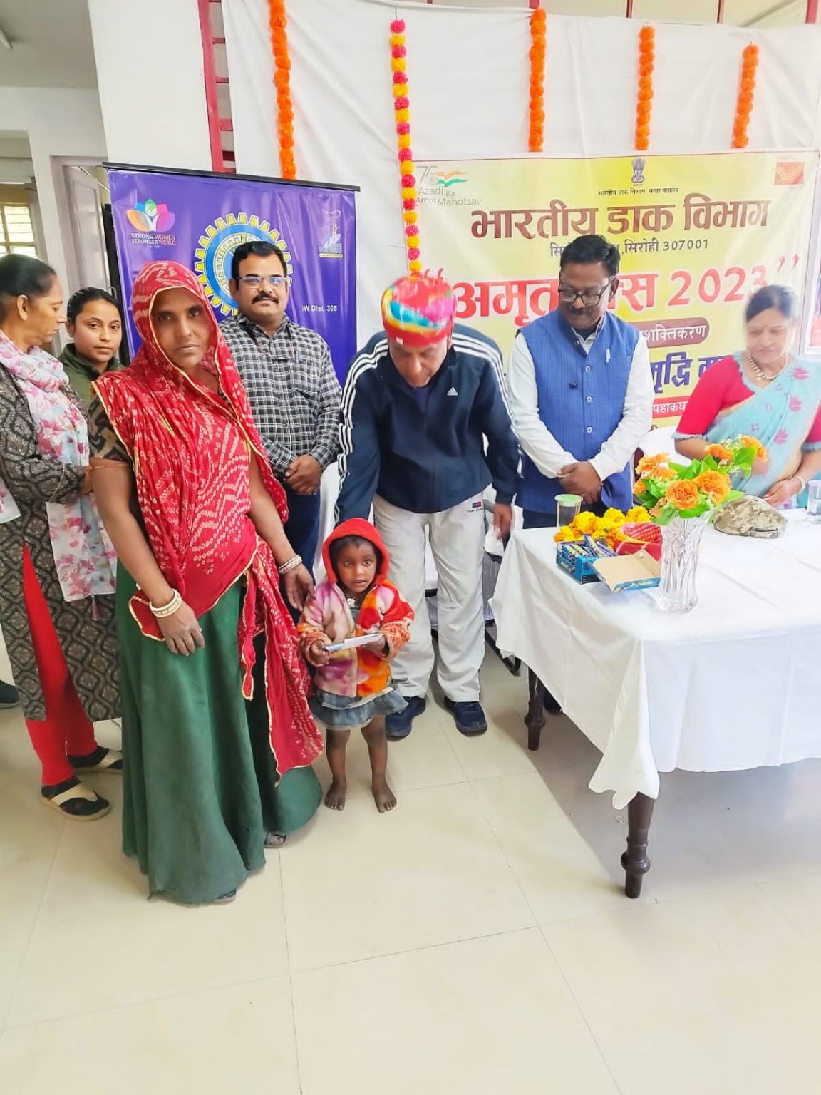 डाक विभाग आबू पर्वत में लगातार चलाए जा रहे सुकन्या समृद्धि योजना अमृत द्वारा खोले गए बालिका के खाते की पासबुक वितरण समारोह का आयोजन पोस्ट ऑफिस आबू पर्वत में किया गया। जिस में सहायक अधीक्षक वासुराम, इनरव्हील क्लब प्रतिनिधि सरोज बंसल, भाजपा मंडल अध्यक्ष टेकचंद भंभाणी, पूर्व पालिका अध्यक्ष सुरेश थिंगर द्वारा बालिकाओं को पासबुक वितरण की गई। इस मौके पर सहायक अधीक्षक वासु राम ने कहा कि भारत सरकार की सुकन्या समृद्धि योजना का राजस्थान भर में लक्ष्य लेकर पोस्ट ऑफिस स्टाफ को टारगेट दिया जो कार्य तेज गति से प्रगति पर है। भाजपा मंडल अध्यक्ष टेकचंद भंभाणी ने कहा कि प्रधानमंत्री जी श्री नरेंद्र मोदी जी द्वारा बेटी बचाओ बेटी पढ़ाओ मुहिम के तहत अग्रसर है। पूर्व पालिका अध्यक्ष सुरेश थिंगर ने कहा कि आबू पर्वत में पूर्व में सुधीर जी जैन द्वारा 50 बेटियां गोद लेकर खाते खुलवाएं एवं वर्तमान में भामाशाह गीता जी अग्रवाल द्वारा 20 बेटियों को गोद लेकर खाते खुलवाए एवं अन्य भामाशाह को खोजा जा रहा है, जो भामाशाह बनकर बेटियों के खाते खुलवाए जायेंगे। हम इस शहर को सांसद देवजी एम पटेल की प्रेरणा से 100% प्रतिशत लक्ष्य की ओर तेज गति से बढ़ रहे है और जल्द ही भारत का पहला सुकन्या शहर घोषित करने की फरवरी के अंत तक आंगनवाड़ी कार्यकर्ता, समाजसेवी संगठन, पार्षदों के सहयोग के संभव हो सकेगा। पोस्ट मास्टर विजयराज ने अतिथि एवं भामाशाह, आंगनवाड़ी कार्यकर्ताओं, स्टाफ सभी का आभार व्यक्त किया।