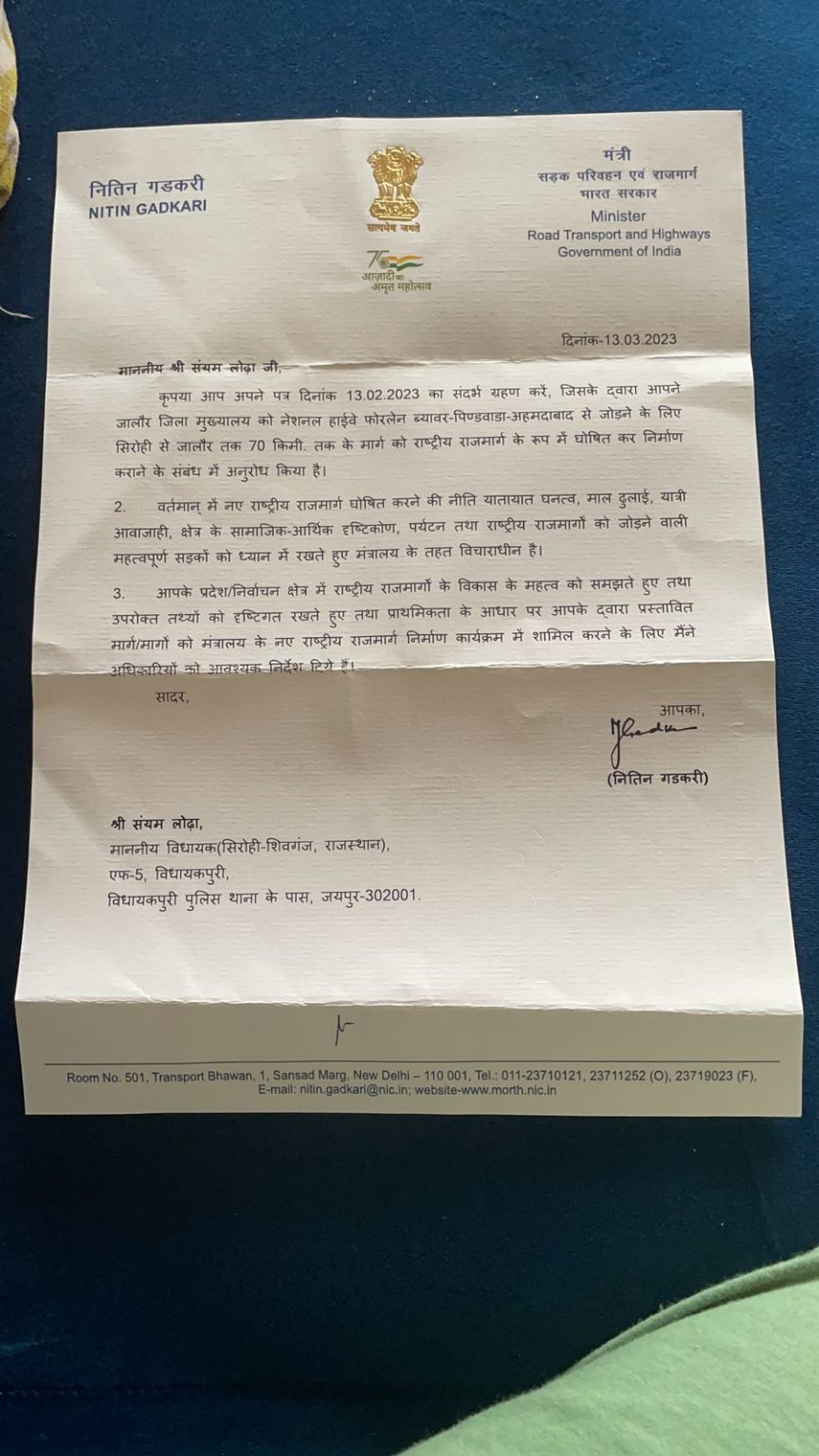 जानकारी के अनुसार मुख्यमंत्री के सलाहकार विधायक संयम लोढ़ा ने विगत 13 फरवरी 2023 को केन्द्रीय सडक़ परिवहन एवं राजमार्ग मंत्री नितिन गडकरी को पत्र भेजकर सिरोही से जालोर तक के 70 किलोमीटर सडक़ मार्ग को ब्यावर-पिंडवाडा-अहमदाबाद से जोडऩे का आग्रह करते हुए बताया था कि जालोर को राष्ट्रीय राजमार्ग से जोडऩे से जालोर मुख्यालय सीधे फोरलेन से जुड़ सकेगा तथा व्यापार सहित आवागमन में भी काफी सुविधा होगी।विधायक लोढा की मांग पर केन्द्रीय मंत्री गडकरी ने विभागीय अधिकारियों को सिरोही-जालोर सडक़ मार्ग को राष्ट्रीय राजमार्ग कार्यक्रम में शामिल करने के निर्देश देेते हुए विधायक संयम लोढ़ा को भेजे पत्र में बताया है कि वर्तमान में नए राष्ट्रीय राजमार्ग घोषित करने की नीति यातायात घनत्व, माल ढुलाई, यात्री आवाजाही, क्षेत्र के सामाजिक व आर्थिक दृष्टिकोण, पर्यटन तथा राष्ट्रीय राजमार्गो को जोडऩे वाली महत्वपूर्ण सडक़ों को ध्यान में रखते हुए मंत्रालय के तहत विचाराधीन है।