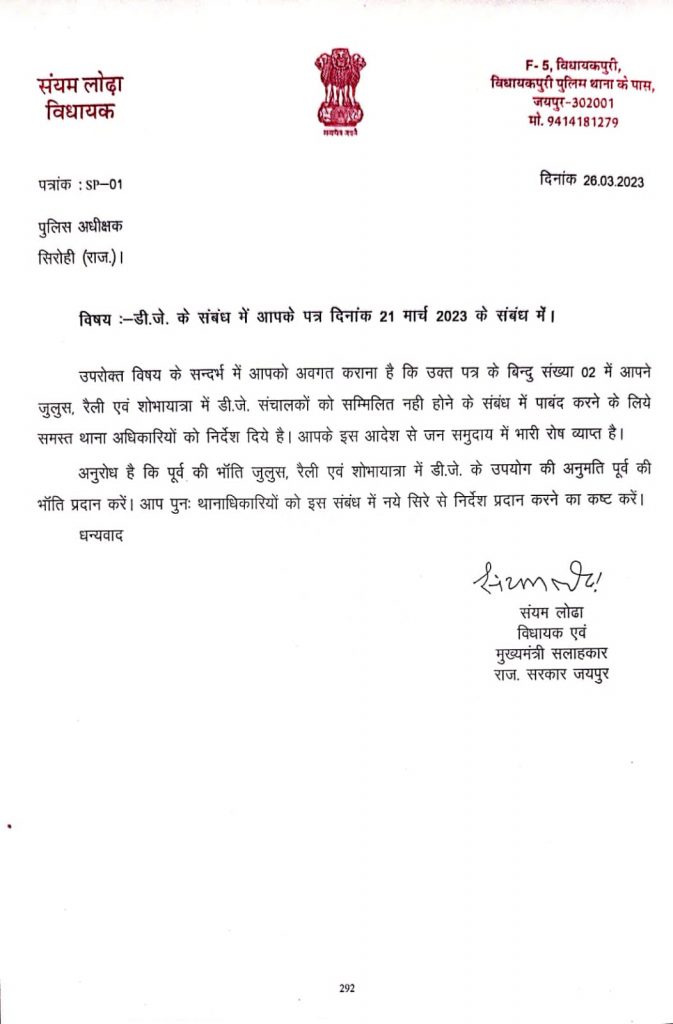 विधायक संयम लोढा ने जुलुस रैली शोभायात्रा में डीजे न बजाने के पुलिस अधीक्षक सिरोही के आदेश पर आपत्ति जताई है। विधायक संयम लोढा ने पुलिसअधीक्षक को पत्र लिखकर इसमे संशोधन कर पूर्व के भांति डीजे का उपयोग करने की अनुमति जारी रखने का आग्रह किया है।पुलिस अधीक्षक सिरोही ने 21 मार्च को समस्त थाना अधिकारियों के नाम जारी आदेश क्रमांक 6305-25 के जरिये पूरे जिले के डीजे संचालको की सूची मंगवाई थी। एसपी ने समस्त थाना अधिकारियों को निर्देश दिये थे कि वे डीजे संचालको को पाबंद करे कि जुलुस, रैली, शोभायात्रा में डीजे नही बजाया जाएगा।