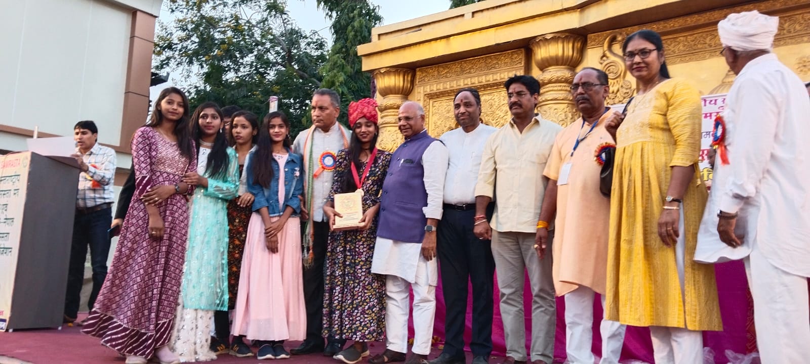 महात्मा गांधी राजकीय विद्यालय सिरोही के गायन दल एवं उसके प्रभारी दिलीप कुमार शर्मा को अन्तर्राष्ट्रीय समरसता मंच के द्वारा शुक्रवार को राजधानी जयपुर में आयोजित एक सम्मान समारोह में ‘‘राजस्थान समरसता रत्न अवार्ड 2023’’ से सम्मानित किया गया। इस मंच के संरक्षक नेपाल के प्रथम उपराष्ट्रपति परमानन्द झा, अन्तर्राष्ट्रीय समरसता मंच के संयोजक एम. पी. टोरडी एवं इण्डियन लाफ्टर चैलेंज फेम ख्याली सहारण के द्वारा दिलीप कुमार शर्मा एवं गायन दल की लीडर दिशा माली को स्वर्ण पदक, साफा, माला, शाॅल एवं स्मृति चिह्न से सम्मानित किया गया। समारोह में महात्मा गांधी विद्यालय सिरोही की बालिकाओं ने नेपाल व भारत का राष्ट्रगान गाकर उपस्थित जन समूह को अभिभूत कर दिया।महात्मा गांधी राजकीय विद्यालय सिरोही को स्थापित हुए चार वर्ष हुए है। उल्लेखनीय बात यह है कि इस विद्यालय की बालिकाओं का गायन दल विश्व के 8 देशों के राष्ट्रगान के गायन के साथ साथ करीब 25 राष्ट्रीय एवं अन्तरराष्ट्रीय भाषाओं में गायन की दक्षता रखता है। बालिकाओं के इस हुनर को देखकर हर कोई हतप्रभ रह जाता है। इस दल के मार्ग दर्शक के रूप में सांस्कृतिक प्रभाग प्रभारी दिलीप कुमार शर्मा का कार्य अति प्रशंसनीय है। उक्त दल के सम्मान के दौश्रान दल प्रभारी टीना माहुर के साथ दिशा माली, निकिता पंवार, प्रियल माली, प्रियंका पटेेल एवं प्राची सिंह राणावत भी शामिल रहें।