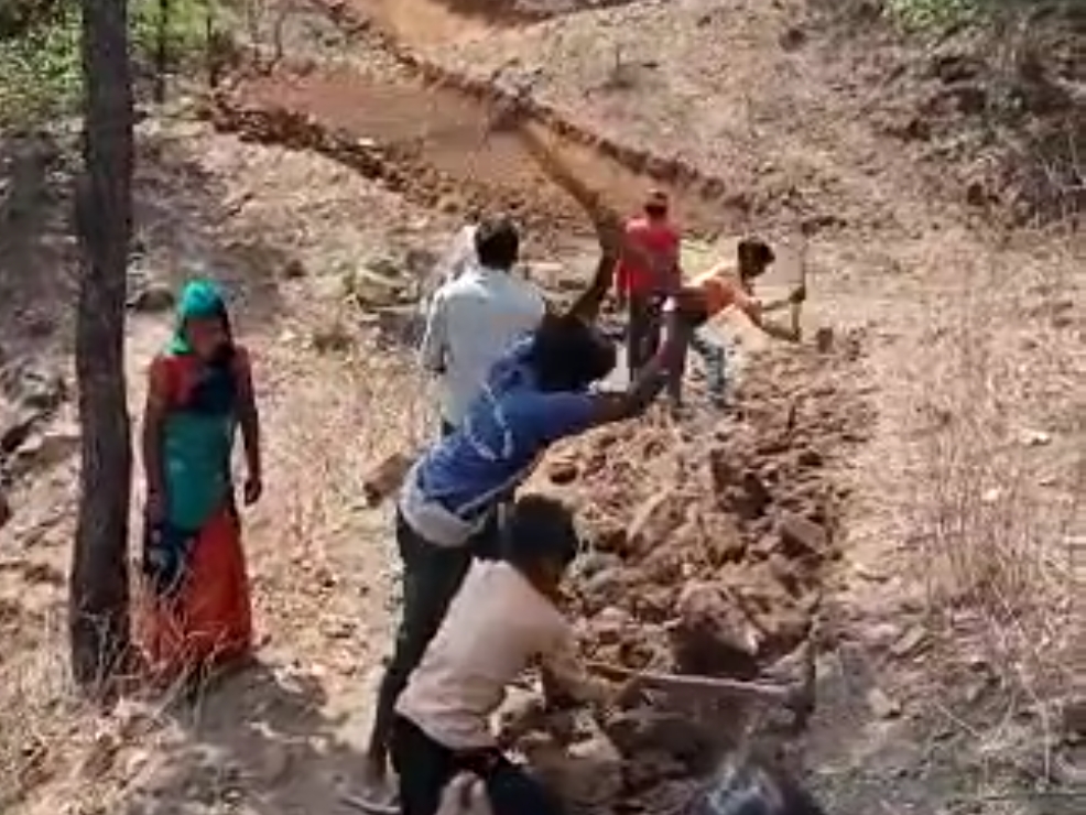 फोटो:– जांबूडी ग्राम पंचायत के बोसा गांव की खादराफली में खुद अपने दम पर सड़क बनाने में दिन रात पसीना बहाते ग्रामीण।