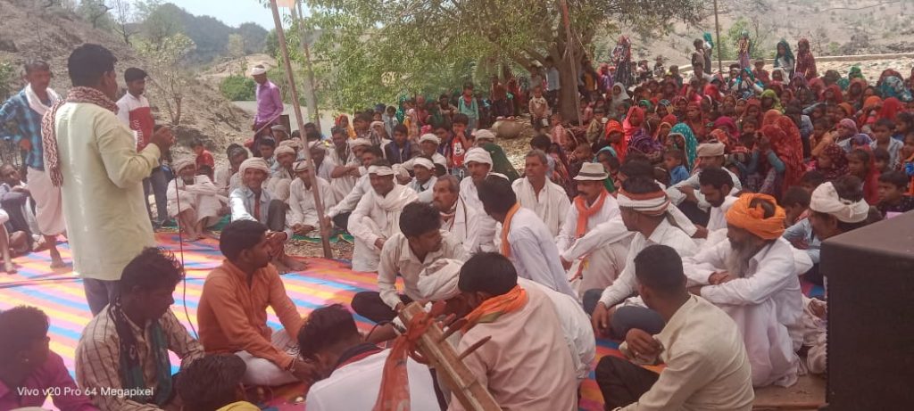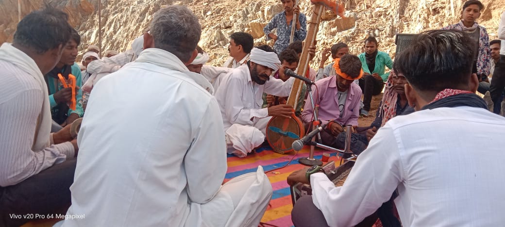फोटो:– रणोरा गांव में माड बावसी के नाम की आखातीज संगत में भजनों की प्रस्तुतियां देते कलाकार।