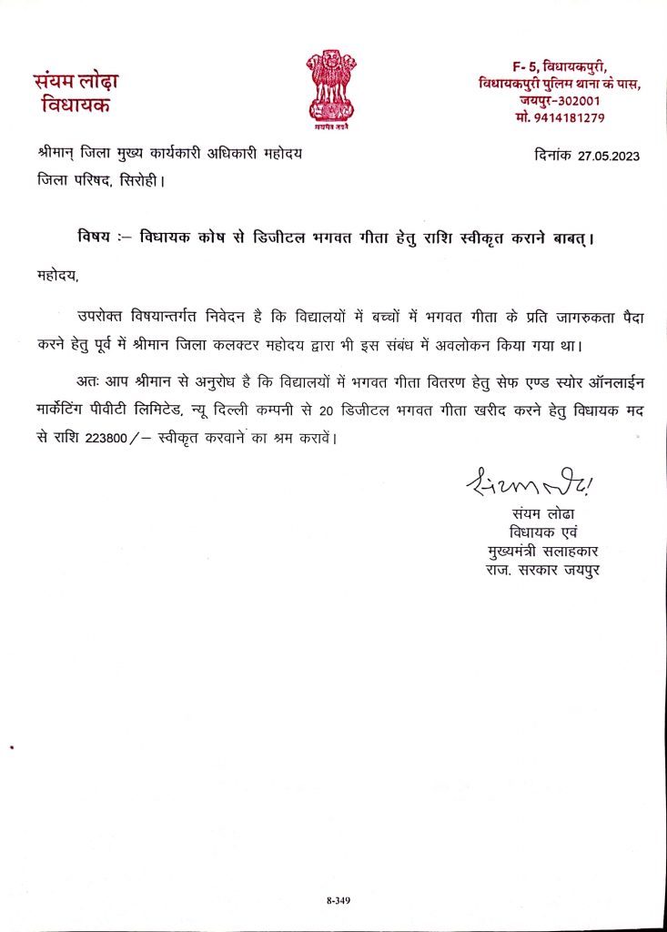 सनातन धर्म की प्रमुख धार्मिक ग्रंथ श्रीमद् भागवत गीता को लेकर बच्चों में जागरुकता पैदा करने के लिए मुख्यमंत्री सलाहकार विधायक संयम लोढ़ा ने श्री श्री रविशंकर की संस्था सेफ एंड स्योर ऑनलाईन मार्केटिंग पीवीटी लिमिटेड नई दिल्ली की ओर से तैयार की गई डिजीटल श्रीमद् भागवत गीता स्कूलों में उपलब्ध करवाने की पहल करते हुए विधायक कोष से 2 लाख 23 हजार 800 रूपए स्वीकृत करने की अनुशंसा की है।गौरतलब है कि श्रीमद् भागवत गीता सनातन धर्म का एक पवित्र गं्रथ है। जिसमें भगवान श्री कृष्ण ने महाभारत के समय जब अर्जुन ने अपनों को युद्ध के मैदान में सामने देख शस्त्र छोड़ दिए थे। उस समय भगवान श्री कृष्ण ने अर्जुन को जो गीता ज्ञान दिया वह एक पुस्तक के रूप में पवित्र ग्रंथ बन गया। यह एक ऐसा धार्मिक ग्रंथ है जिसकी पूरे विश्व में जयंति मनाई जाती है। वर्तमान समय में स्कूलों में पढऩे वाले बच्चों में श्रीमद् भागवत गीता के प्रति जागरुकता पैदा करने के उद्देश्य से विधायक लोढ़ा ने पहल करते हुए श्री श्री रवि शंकर की संस्था सेफ एंड स्योर ऑनलाइन मार्केटिंग पीवीटी लिमिटेड की ओर से तैयार की गई 20 डिजीटल श्रीमद् भागवत गीता खरीदने के लिए विधायक कोष से 2 लाख 23 हजार 800 रूपए की स्वीकृति प्रदान की है।