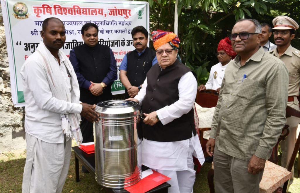 राज्यपाल श्री कलराज मिश्र ने शनिवार को राजभवन में कृषि विश्वविद्यालय जोधपुर की ओर से अनुसूचित जनजाति उप परियोजना के अंतर्गत माउंट आबू क्षेत्र के आदिवासी किसानों को मिनी दाल मिल, उन्नत कुक्कुट नस्ल एवं स्टील बीज भंडारण टंकियों का वितरण किया। राज्यपाल श्री मिश्र ने इस अवसर पर कहा कि जल, जंगल और जमीन को बचाने के साथ-साथ देश की संस्कृति और परंपराओं के संरक्षण में आदिवासियों का महत्वपूर्ण योगदान है। उन्होंने कहा कि जनजाति क्षेत्र के लोगों को स्वावलंबी एवं आर्थिक रूप से सशक्त बनाकर मुख्यधारा में लाने के लिए सतत प्रयास जरूरी हैं।