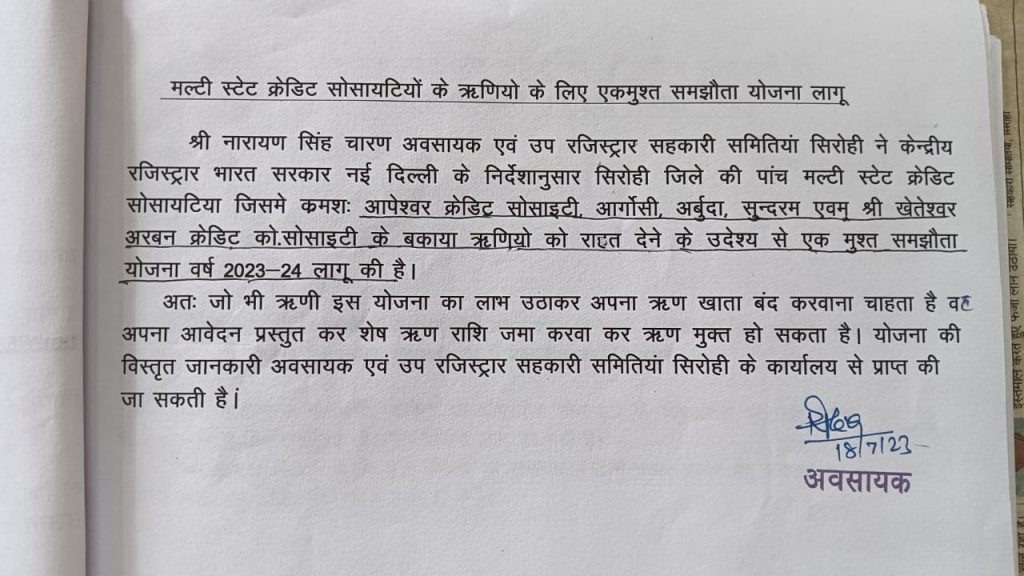 मल्टी स्टेट क्रेडिट सोसायटीयो के ऋणीयों को राहत देने के लिए एक मुस्त समझौता योजना शुरू की है जो ऋणी इस योजना का लाभ लेना चाहते है वे इस योजना मै अपना पंजीयन करवा कर ऋण की बकाया राशि भर कर ऋण मुक्त हो सकते हैसहकारी समिति के उप रजिस्ट्रार एवं अवसायक नारायण सिंह चारण ने बताया की सिरोही जिले मै कार्यरत विभिन्न मल्टी स्टेट सोसायटी जिनमे आपेश्वर क्रेडिट सोसाइटी, आर्गोसी, अर्बुदा, सुन्दरम एवम् श्री खेतेश्वरअरबन क्रेडिट को. सोसाइटी का भारत सरकार के केंद्रीय रजिस्ट्रार ने उन्हें अवसायक नियुक्त किया है व उनके निर्देश पर इन सोसायटीयो मै बकाया ऋणीयों के लिए एक समझौता योजना लागु की है जिसमे ऋणी सदस्य अपने बकाया ऋण राशि की चुकाकर ऋण मुक्त हो सकता है इस योजना के बारे मै विस्तृत जानकारी वे कार्यालय मै आकर देख सकते है चारण ने बताया की जो ऋणी अपना ऋण जमा नहीं करवाएंगे उनके खिलाफ सरकार कार्यवाही करेगी।