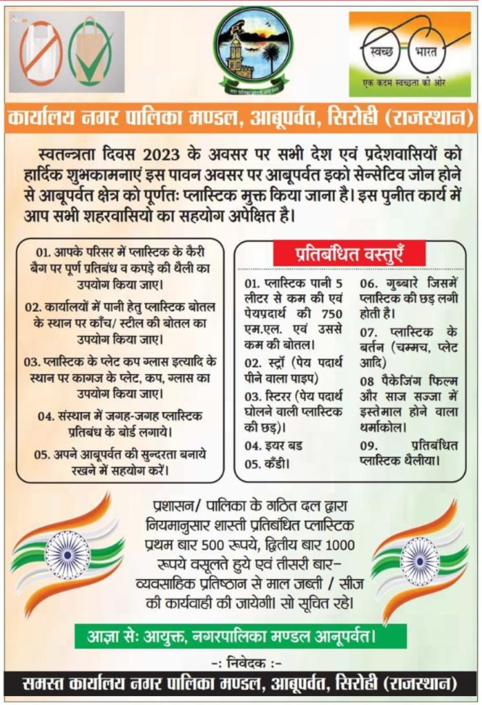 नगरपालिका मण्डल आबूपर्वत, सिरोही राजस्थान की ओर से सभी देश एवम प्रदेशवासियों को स्वतंत्रता दिवस 2023 की हार्दिक शुभकामनाएं।