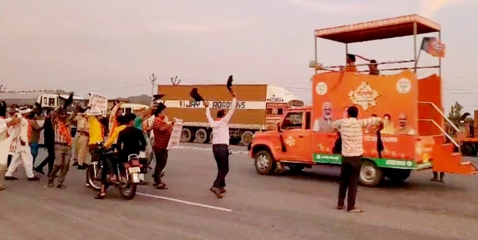 भाजपा परिवर्तन संकल्प यात्रा का सरूपगंज मे शिवसैनिको ने काले झंडे दिखाकर कीया विरोध प्रदर्शन ।