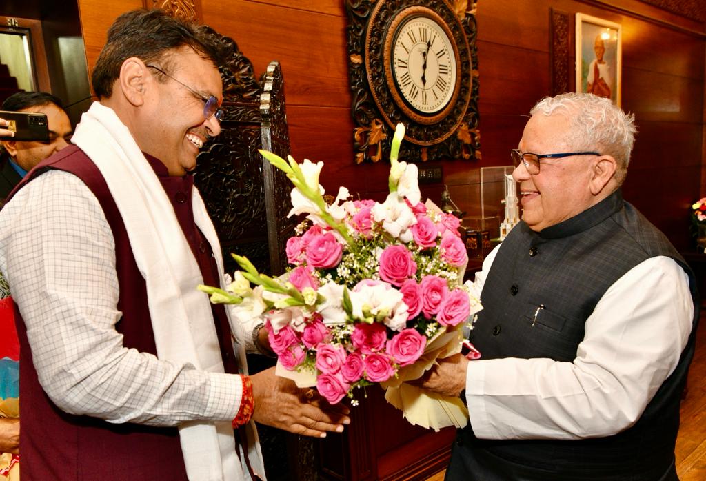 प्रदेश के मुख्यमंत्री श्री भजन लाल शर्मा ने शनिवार को राजभवन पहुंचकर राज्यपाल श्री कलराज मिश्र से मुलाकात की। मुख्यमंत्री बनने के बाद राज्यपाल से उनकी यह पहली शिष्टाचार भेंट थी।राज्यपाल श्री मिश्र ने मुख्यमंत्री श्री भजनलाल शर्मा को बधाई और शुभकामनाएं दी तथा उम्मीद जताई कि उनके कुशल नेतृत्व में राजस्थान तेजी से विकास पथ पर आगे बढ़ेगा।