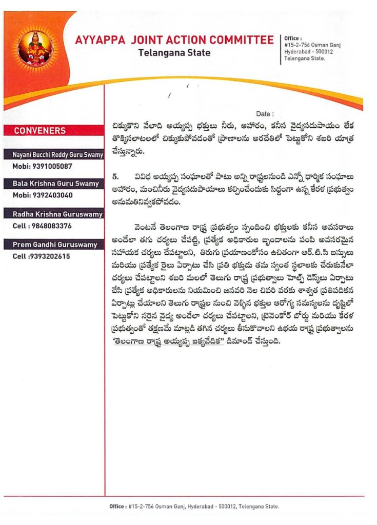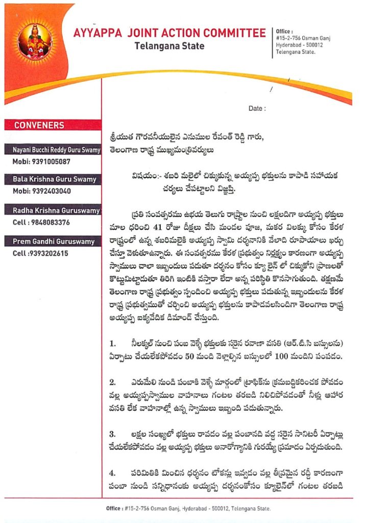 हर साल दोनों राज्यों के तेलुगु लोग माला पहनते हैं और लाखों स्वामी, छोटे बच्चे और महिलाएं अयप्पा स्वामी के दर्शन के लिए सबरीमाला जाते हैं। इस वर्ष जाने वाले अय्यप्पा भक्तों को कई कठिनाइयों का सामना करना पड़ा, दर्शन के लिए घंटों कतारों में खड़े रहना, ताजा पानी, भोजन, उचित चिकित्सा सुविधाओं जैसी बुनियादी सुविधाओं की कमी, निलक्कल से पांभा तक उचित परिवहन प्रणाली की कमी, एरुमेली से पांभा तक आने वाले वाहन सड़कों पर घंटों रुका रहा और यातायात नियंत्रित नहीं किया गया, हेल्प डेस्क सुविधाओं की कमी और उचित स्वच्छता व्यवस्था के कारण, बच्चे, महिलाएं और अयप्पा स्वामी अपनी जान हथेली पर लेकर सबरी यात्रा कर रहे हैं।