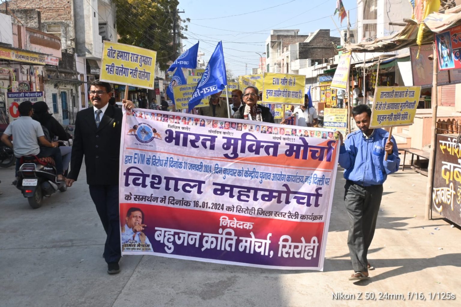 भारत मुक्ति मोर्चा के राष्ट्रीय अध्यक्ष वामन मेश्राम के आह्वान पर सिरोही सहित देश भर मे 567 जिलों में ईवीएम के स्थान पर बैलेट पेपर से चुनाव कराने हेतु जिला मुख्यालय पर बहुजन क्रांति मोर्चा एवम भारत मुक्ति मोर्चा जिला संयोजक एडवोकेट सुंदरलाल मोसलपुरिया के नेतृत्व में पांच जनवरी को ज्ञापन और दस जनवरी को धरना प्रदर्शन के बाद 16 जनवरी 2024 को नारेबाजी करते हुए जिला मुख्यालय पर रैली निकाली गई । रैली के समापन उपरांत जिला कलक्टर को राष्ट्रपति महोदया के नाम ज्ञापन सौंपा गया।