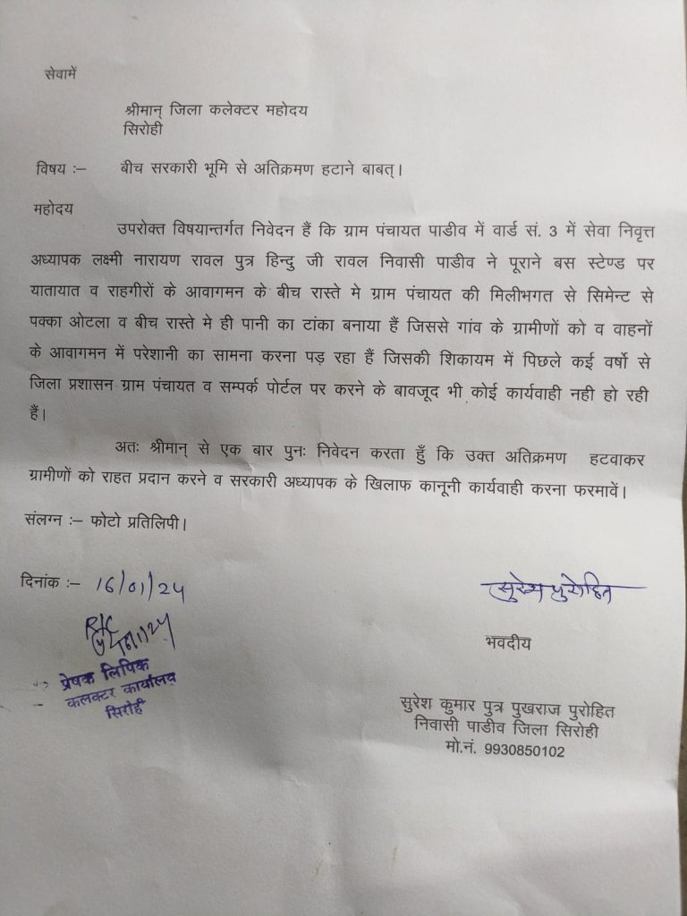 उन्होंने जिला कलेक्टर शुभम चौधरी को अतिक्रमण हटाने की शिकायत देकर बताया की पाडीव मे कबूतर चबूतरे के पास सरकारी भूमि पर कब्जा करके अतिक्रमण किया है । अतिक्रमी व ग्रामपंचायत के दोषी कर्मचारियों पर कानूनी कार्यवाही करने की गुहार लगाई है.