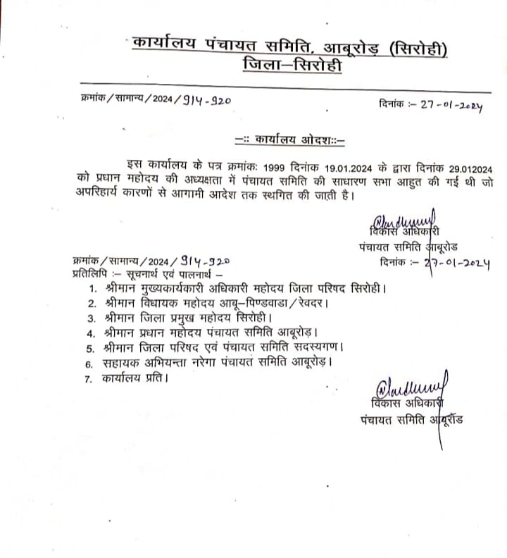 सिरोही:- आबूरोड पंचायत समिति की साधारण सभा 29 जनवरी को होनी थी बैठक, हुई स्थगित,