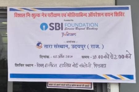 पिण्डवाड़ा – स्टेट बैंक ऑफ इंडिया फाउंडेशन के सहयोग से विशाल निःशुल्क नेत्र परीक्षण एवं मोतियाबिंद ऑपरेशन चयन शिविर शुक्रवार 5अप्रैल को सुबह 10 बजे से दोपहर 2 बजे तक आयोजक तारा संस्थान उदयपुर के द्वारा शिवम हॉस्पिटल, ओवर ब्रिज के पास, हाऊसिंग बोर्ड कॉलोनी पिण्डवाड़ा में आयोजित किया जाएगा।