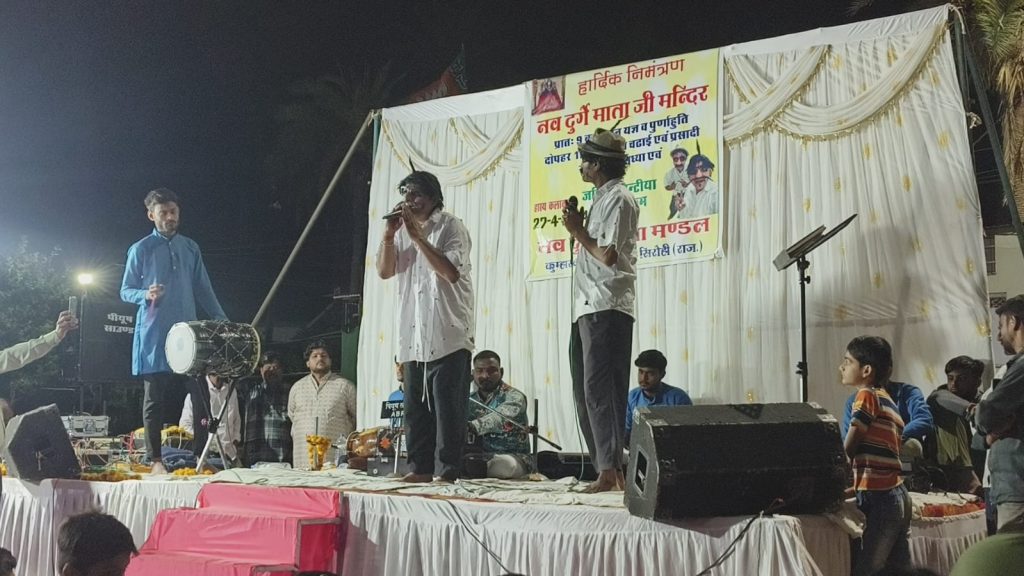 भक्ति रस में भजन संध्या में राजस्थान के सुप्रसिद्ध कॉमेडियन जगिया – पिंटिया ने राजस्थान एवं मारवाड़ी अंदाज में कॉमेडी करते हुए भक्तो को आनंदित किया। देर रात तक भक्तो ने भक्तिरस में रम कर माताजी के भजनों का आनंद लिया। इस मौके पर नवदुर्गे गरबा मंडल अध्यक्ष सुरेश थिंगर ने बताया कि वर्ष 2014 में मां नवदुर्गे की प्रतिमा एवं मंदिर की 3दिवसीय प्राणप्रतिष्ठा बड़े धूमधाम से की गई थीं। हर वर्ष मां नवदुर्गे एवं साई नाथ का वार्षिकोत्सव ग्रामवासी बड़े ही हर्षोल्लास के मनाते है। इस वर्ष मां नवदुर्गे का 10वां वार्षिकोत्सव आयोजित किया गया। जिसमें श्रद्धालुओं मां नवदुर्गे का आशीर्वाद प्राप्त किया।