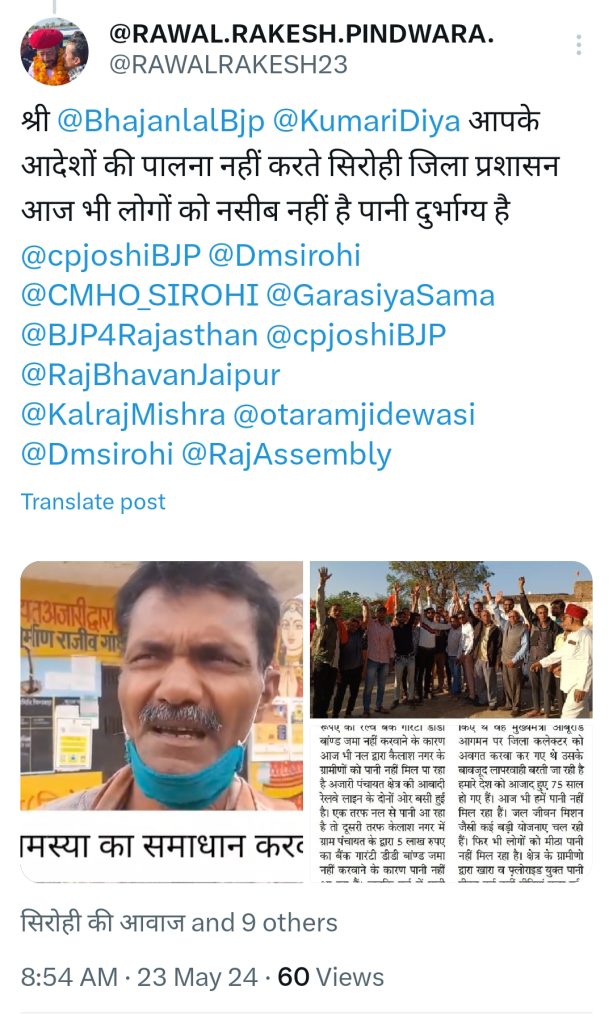 पिंडवाड़ा उपखंण्ड कार्यालय से मात्र डेढ़ किलोमीटर की दूरी पर स्थित ग्राम पंचायत अजारी के कैलाश नगर वार्ड पंच राकेश रावल द्वारा मुख्यमंत्री को एक्स हैंडल पर शिकायत करने के बाद पिण्डवाङा उपखंण्ड अधिकारी रवि प्रकाशजी लखारा व पीएचडी ए ई न राणसिहजी जे ई एन जितेंन्द्र लाईट ए ई न अमृतजी आर आई भैरारामजी पटवारी हेमलता ने कैलाश नगर में पेयजल की पाईप लाइन का मौका निरीक्षण किया । पिंडवाड़ा पीएचडी ए ई एन राणसिह ने 2 दिन में कार्य पूरा करवाने का आश्वासन दिया और कहा कि बहुत जल्द लोगो को पानी मिल जाएगा ।