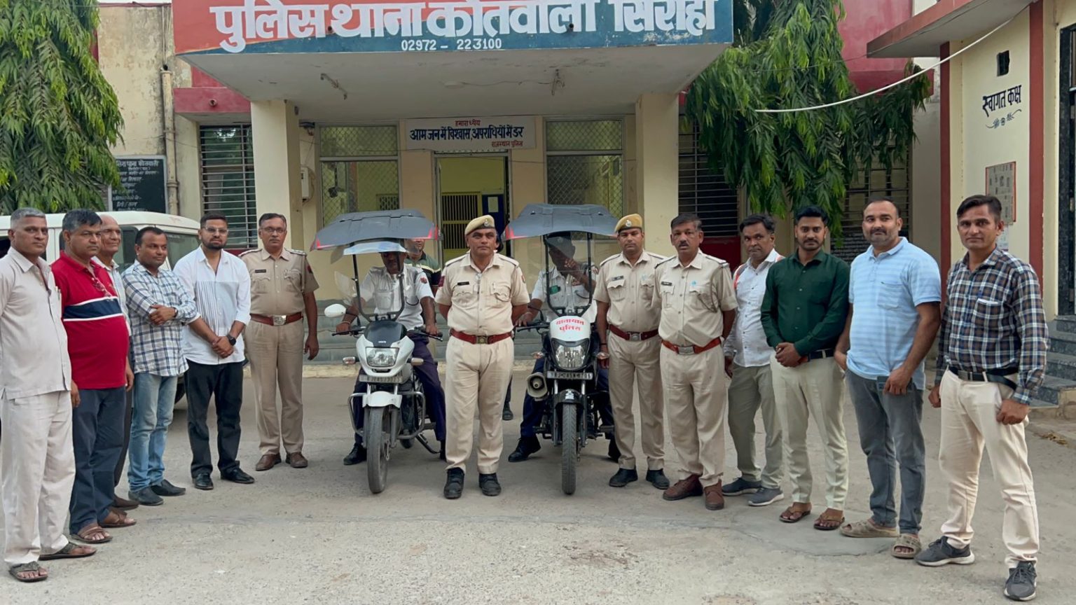 इस वर्ष राजस्थान में गर्मी से तापमान काफी उच्च स्तर तक पहुंच चुका है जिससे आमजन के साथ साथ उनकी सेवा में लगे पुलिकर्मियों को भी असहनीय धूप का सामना करना पड़ रहा है।राजस्थान पुलिस के यातायात पुलिस अधिकारियों को तपती धूप में ड्यूटी करने में काफी परेशानी का सामना करना पड़ रहा है। जिसको देखते हुए सिरोही के ब्रांड एंबेसडर व भारत भ्रमण तक की यात्रा करने वाले बाइक राइडर दिलीप पटेल सिरोही द्वारा भारत में निर्मित सेपल ऑटो कंपनी के धूप बारिश में बचाव के लिए सुरक्षा कवच बाइक पर लगाने के किट सिरोही कोतवाली थाना यातायात स्टाफ की बाइको पर लगवाएं जिससे सुरक्षा कर्मियों को धूप व बारिश से खुद का बचाव करने के लिए काफी कारगर साबित होगा ।