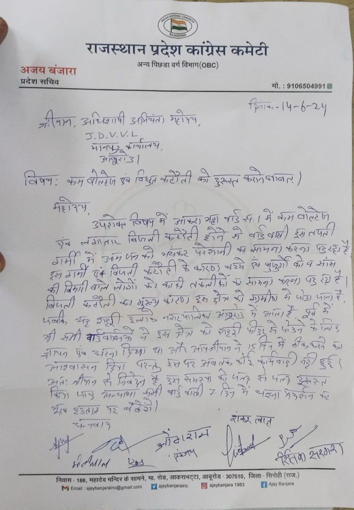 राजस्थान प्रदेश कांग्रेस कमेटी ओबीसी विभाग के प्रदेश सचिव अजय बंजारा के नेतृत्व में अधिशासी अभियंता को ज्ञापन दिया । क्षेत्र में हो रही लगातार बिजली कटौती को लेकर क्षेत्र की जनता के साथ बिजली विभाग मानपुर कार्यालय में अधिशासी अभियंता को ज्ञापन दिया। ज्ञापन में आकरा भट्टा क्षेत्र में हो रही लगातार बिजली कटौती कम वोल्टेज एवं शहरी लाइन से जोड़ने की मांग की गई। भीषण गर्मी के कारण स्वास्थ्य रोगियों एवं बच्चे बुजुर्गों को हो रही परेशानी बिजली कटौती के कारण और गंभीर हो जाती है जिस कारण क्षेत्र में दो-तीन लोगों की मृत्यु हो चुकी है समस्या का जल्द से जल्द निदान करने के लिए सभी क्षेत्रवासियों ने मिलकर ज्ञापन दिया ।