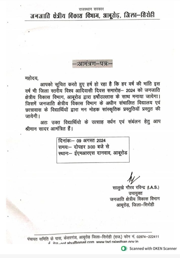 आबू रोड पंचायत समिति के अंतर्गत तीन अलग-अलग गांवों में 9 अगस्त शुक्रवार को विश्व आदिवासी दिवस कार्यक्रम के आयोजन समारोह पूर्वक होंगे। ग्राम पंचायत निचलागढ़ के आश्रम छात्रावास में गरासिया समाज विकास सेवा समिति जिला सिरोही, पंचायत समिति आबू रोड एवं ग्राम पंचायत निचलागढ़ के संयुक्त तत्वाधान में सुबह 11:00 बजे से, ग्राम पंचायत क्यारियां के रेडवाकला में आदिवासी विकास सेवा समिति जिला सिरोही के तत्वाधान में सुबह 10:00 बजे से, तथा जनजाति क्षेत्रीय विकास विभाग की ओर से दानवाव के आवासीय विद्यालय में 3:00 बजे से कार्यक्रम होंगे।