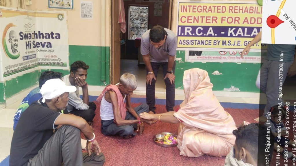 कालन्द्री: रक्षा बंधन के पावन अवसर पर पँचायत सिमिति सदस्य (डेलिकेट) गीता बहन ने नशा मुक्ति एवं पुनर्वास केंद्र कालन्द्री संस्था परिचर में भर्ती मरीजो को राखी का रक्षा सूत्र बांधा गया। उन्होंने सभी मरीजो से आग्रह करके लाभार्थियो को किसी भी प्रकार के नशे से दूरी बनाने की अपील की गई। वही संस्था परिचर में हरियालो राजस्थान की तहत मुख्यमंत्री सघन की तहत एक पौधा मां के नाम में पीपल का पौधा लगाया गया। वही सामाजिक कार्यकर्ता नटवर सिंह ने गीता बहन का आभार जताते हुए कहा की संस्था में मरीज है जो दूर दराज क्षेत्र से है रक्षा बंधन के दिन इस त्योहार में किसी की बहिन नही तो किसी की मजबूरियां है लेकिन आज रक्षा सूत्र बांधकर उंनको नशा मुक्ति की शपथ दिलाकर बड़ा उपकार किया है। इस मौके पर स्वास्थ्य कर्मी प्रभाराम घांची, करनी दान सारण,मोतीलाल रांगी साहब,योग शिक्षक रेणु रेखा, रवि,बहादुर सिंह,जगमाल देवासी, उत्तम,खेतल,विष्णु, मोती सिह,सागर,रणजीत,ललित,भुराराम, बाबाराम,प्रकाश,जीवाराम, भीमाराम, की मोजुदगी में रक्षा बंधन का पर्व संस्था परिचर में मनाया गया।