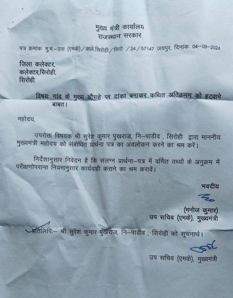 – राजस्थान के मुख्यमंत्री कार्यालय से उप सचिव मनोज कुमार ने सिरोही जिला कलेक्टर को पाडीव गांव के चौराहे पर टांका बनाकर किए गए अतिक्रमण को हटाने के निर्देश दिए हैं। इस संबंध में नियमित जांच और परीक्षण कर कार्यवाही करने की आवश्यकता पर जोर दिया है। यह निर्देश 4 सितंबर को जारी किया गया था और आज जिला प्रशासन को प्राप्त हुआ है। गौरतलब है कि पाडीव निवासी सुरेश पुखराजजी पुरोहित ने पहले ग्राम पंचायत, तहसील अधिकारी सहित अन्य स्थानीय अधिकारियों से शिकायत की थी। लेकिन, स्थानीय स्तर पर कोई ठोस कार्यवाही न होने के कारण उन्होंने मुख्यमंत्री के मुंबई आगमन पर ज्ञापन सौंपकर इस मुद्दे की जानकारी दी। उनके ज्ञापन के बाद, मुख्यमंत्री कार्यालय ने इस मामले पर त्वरित संज्ञान लेते हुए जिला कलेक्टर सिरोही को उचित जांच और नियमानुसार कार्यवाही सुनिश्चित करने के निर्देश दिए। 4 सितंबर को जारी आदेश की प्रति सुरेश पुरोहित को प्राप्त हो गई है, जिसमें स्पष्ट किया गया है कि जिला कलेक्टर को अतिक्रमण हटाने के लिए जांच और नियमों के अनुसार कार्यवाही करनी होगी। इस आदेश से अतिक्रमण के खिलाफ सुरेश पुरोहित की लंबी लड़ाई को सफलता मिलने की उम्मीद है।आज मुंबई में पत्रकारों से बातचीत करते हुए सुरेश पुरोहित ने बताया कि उन्हें आशा है कि इस निर्देश के बाद जिला प्रशासन जल्द ही अतिक्रमण हटाने की दिशा में ठोस कदम उठाएगा।
