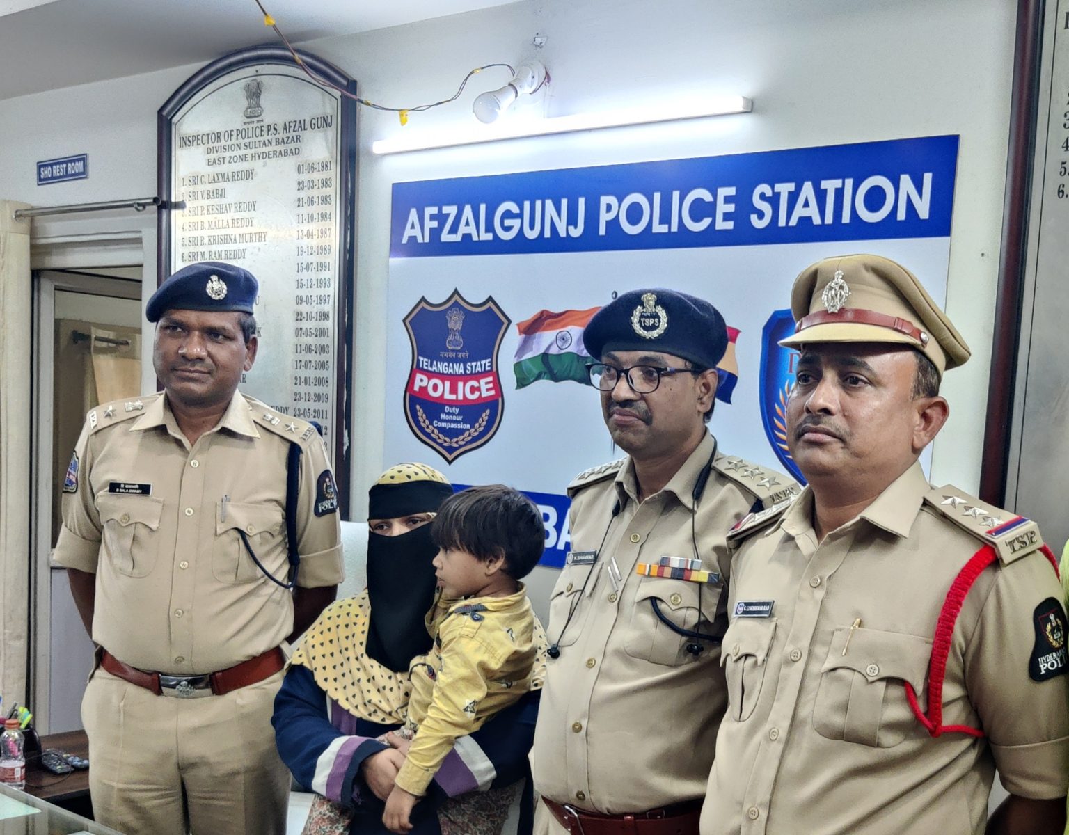 एसएचओ श्री जी लिंगेश्वर राव, डीएसआई पी राम किशन, क्राइम स्टाफ एचसी बी श्रीकांत, पीसी के मोहम्मद सुलेमान, जी श्रीकांत, के विशाल कुमार, मोहम्मद आदिल अहमद, डी चंद्रशेखर और उदय कुमार और मोहम्मद असद कादरी के नेतृत्व में पुलिस अफजलगंज की टीम ने सभी स्थानों पर सीसीटीवी फुटेज की पुष्टि की, यानी पब्लिक गार्डन, नामपल्ली रेलवे स्टेशन, सिकंदराबाद रेलवे स्टेशन इंदिरा पार्क, टैंक बंड और एलएंडटी मेट्रो स्टेशन रात के समय अलग-अलग स्थानों पर और सभी बस स्टैंड और रेलवे स्टेशनों पर गुमशुदा लड़के की तस्वीर दिखाई। सीसीटीवी फुटेज की पुष्टि करते समय, संदिग्ध को दबीरपुरा फ्लाईओवर ब्रिज पर बच्चे के साथ देखा गया था, तुरंत टीम मौके पर पहुंची और आरोपी व्यक्ति को पकड़ लिया जो बच्चे के साथ दबीरपुरा रेलवे स्टेशन पर ट्रेन में चढ़ने की कोशिश कर रहा था ।