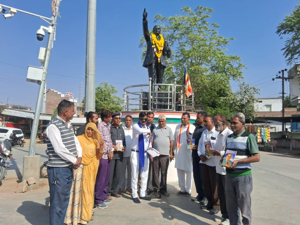 सर्वप्रथम बाबा साहब की प्रतिमा पर पूर्व 22 परगना अध्यक्ष भीमारामजी मेघवाल , द्वारा माल्यार्पण किया गया, साथ हीं उपस्थित गणमान्य नागरिकों, जिनमे पूर्व ब्लॉक कांग्रेस अध्यक्ष तेजारामजी मेघवाल , भाजपा नगर कोषाध्यक्ष महेंद्र सिंह जी, भाजपा सोसल मिडिया प्रभारी ईश्वर लाल राठौर,सेवानिवृतत प्रधानाचार्य पोपट लालजीराठौड़ ,केसाराम मेघवाल, गोविन्द भाटी, प्रागारामजी राठौड़, नगारामजी परमार, मेघ मानव सेवा समिति के सदस्य हँसाराम मनोरा, टीलाराम राठौड, छगन लाल परमार, खुसाल परमार, अशोक परमार, आदि उपस्थित सभी सदस्यों द्वारा प्रतिमा पर माल्यार्पण किया गया ततपश्चात सभी ने संविधान की प्रस्तावना को पढ़ते हुए, बाबा साहब के आदर्शो पर चलते हुए, संविधान की पालना करने एवं संविधान को बचाये रखने का संकल्प लिया गया, एवं बाबा साहब को विनम्र श्रदांजलि दी, एवं संविधान दिवस की हार्दिक बधाईया दी