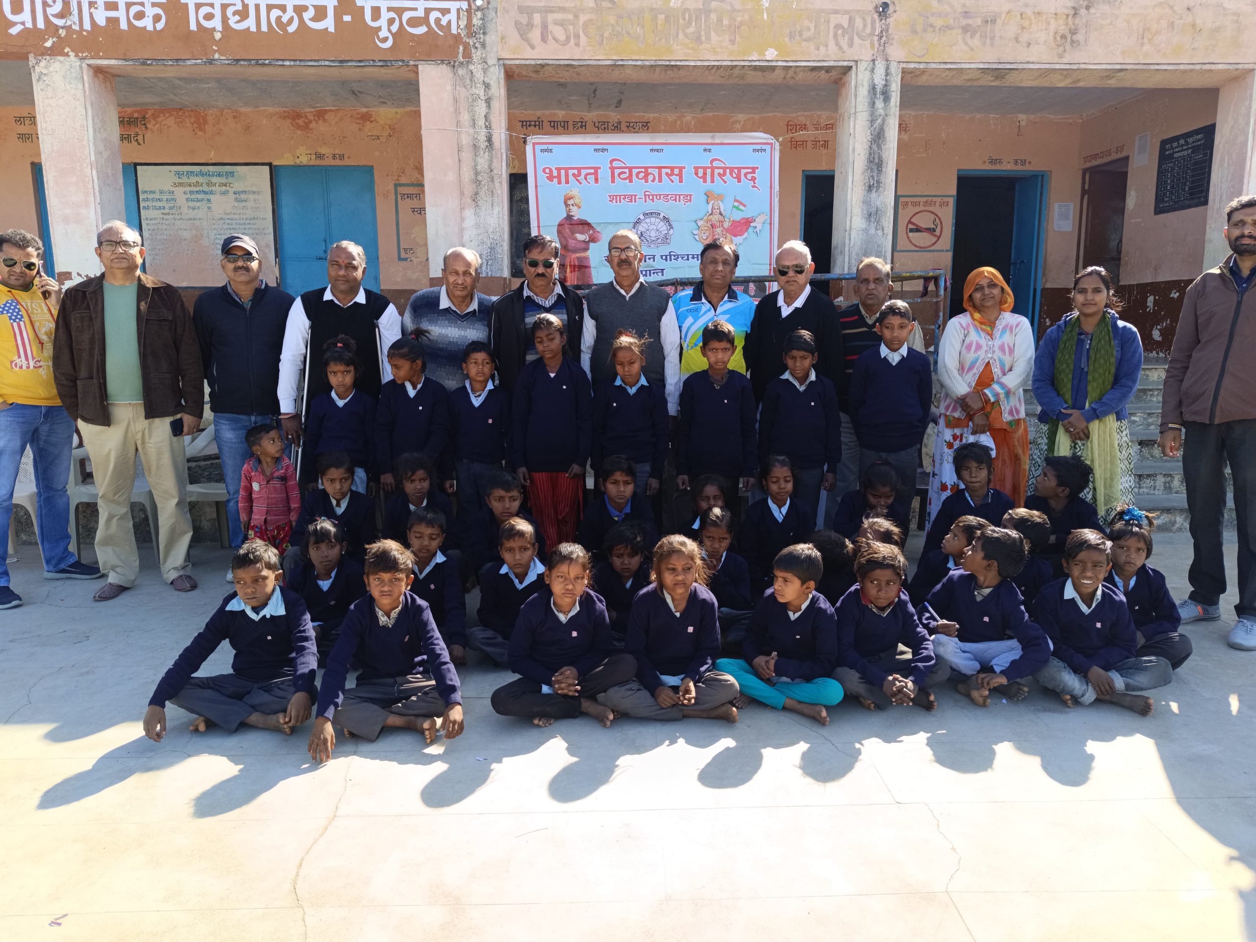 भारत विकास परिषद् शाखा पिण्डवाडा द्वारा ग्राम पंचायत आदर्श डूगरी के राजकीय प्राथमिक विधालय फुटेला के 36, ग्राम पंचायत माण्डवाड़ा ख़ालसा के राजकीय प्राथमिक विधालय पीपली वाला ओडा के 61, सिंगारा जोड़ के 56, ग्राम पंचायत भावरी के राजकीय उच्च प्राथमिक विद्यालय नवीन भावरी के 22 कुल 175 विधार्थियों को स्वेटर वितरित किये गये. परिषद के सेवा प्रकल्प प्रभारी गोविन्द सिंह चौधरी ने बताया कि प्रति वर्ष की भांति इस वर्ष भी परिषद शाखा पिण्डवाड़ा की ओर से 500 स्वेटर वितरित करने के लक्ष्य के अन्तर्गत आज 175 स्वेटर वितरित किए गए इस प्रकार इस वर्ष अब तक 450 स्वेटर वितरित किए जा चुके हैं। उक्त कार्यक्रम के अवसर पर परिषद के जसवंत सिंह चौहान द्वारा सभी विधार्थियों को मन लगाकर पढ़ाई करने, नियमित विधालय में शिक्षा ग्रहण करने एवं स्वास्थ्य के प्रति सजग रहने हेतु प्रेरित किया गया साथ ही नैतिक शिक्षा की जानकारी भी प्रदान की गई। नए स्वेटर पाकर सभी विद्यार्थियों के चेहरे पर खुशी छलक रही थी। संस्था प्रधान द्वारा परिषद् का आभार प्रकट किया गया। कार्यक्रम पश्चात परिषद् के समस्त सदस्यों द्वारा वास्तानेश्वर महादेव मंदिर में दर्शन कर जगत कल्याण की कामना की गई।इस अवसर पर परिषद के डॉ रमेश खण्डेलवाल, गोविन्द सिंह चौधरी, धर्मेंद्र खण्डेलवाल, भेराराम कुम्हार, जसवंत सिंह चौहान, श्रवण रावल, विजयराज सोनी, भवरेश प्रजापत, प्रकाश चंद्र पुरोहित, प्रधानाचार्य मोहन लाल कलबी, पीईईओ विजय प्रकाश गौतम, पीईईओ अशोक पुरोहित, अंजना कुमारी, सुनीता चौधरी, दिलीप, सुरेश चंद्र मीणा, सीता कुमारी, रूपाराम देवासी, विनोद गमेती आदि शिक्षक व बच्चे उपस्थित थे.