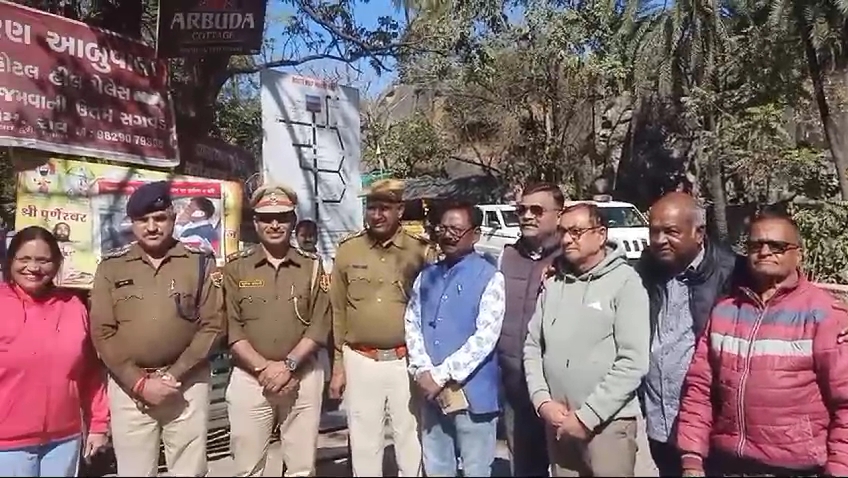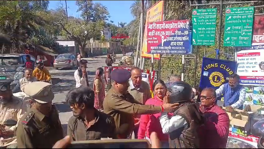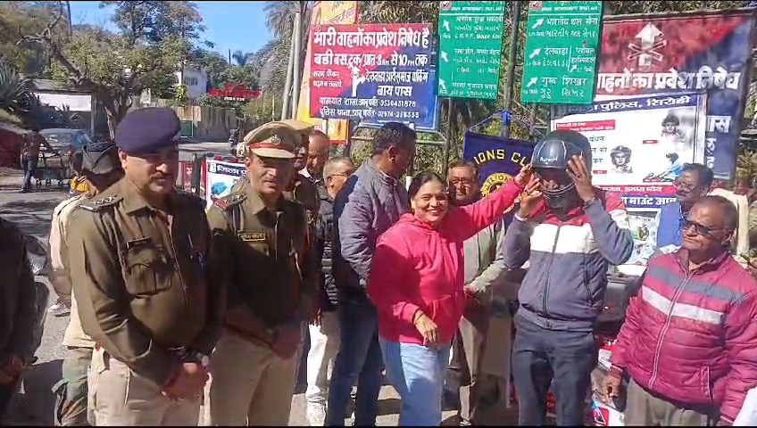 सड़क सुरक्षा सप्ताह के अंतर्गत लाइंस क्लब एवं जर्नलिस्ट एसोसिएशन ऑफ़ राजस्थान( जार )माउंट आबू के सौजन्य से राजस्थान पुलिस डीएसपी, गोमाराम चौधरी,थाना प्रभारी सुरेश चौधरी,यातायात प्रभारी सोमदेव चौधरी, सीआरपीएफ डिप्टी कमांडेंट शिवराज सिंह, बीएसएफ पूर्व डी.जी. एम एल कुमावत ने लायंस क्लब एवं जर्नलिस्ट एसोसिएशन ऑफ़ राजस्थान शाखा आबू पर्वत के द्वारा निशुल्क हेलमेट वितरण ढूँड़ाई पुलिया पर दो पहिया वाहन चालकों को हेलमेट पहनाकर 51 लोगों को जागरूकता संदेश दिया। इस मौके पर लायंस क्लब अध्यक्ष अंजना गुजराल, सचिव अजय बंसल,टोनी गुजराल जार सदस्य, संजय सिंघल, पुष्पेंद्र सिंह, चुंडावत, अरुण जैन एवं पूर्व पालिका अध्यक्ष सुरेश थिंगर ,निमित पटेल,हेमराज चौधरी, उम्मेद सिंह ,युसूफ हुसैन,किशन दहिया,प्रशांत शोत्रीय,कमलेश प्रजापत एव समस्त यातायात कर्मी मौजूद रहे ।