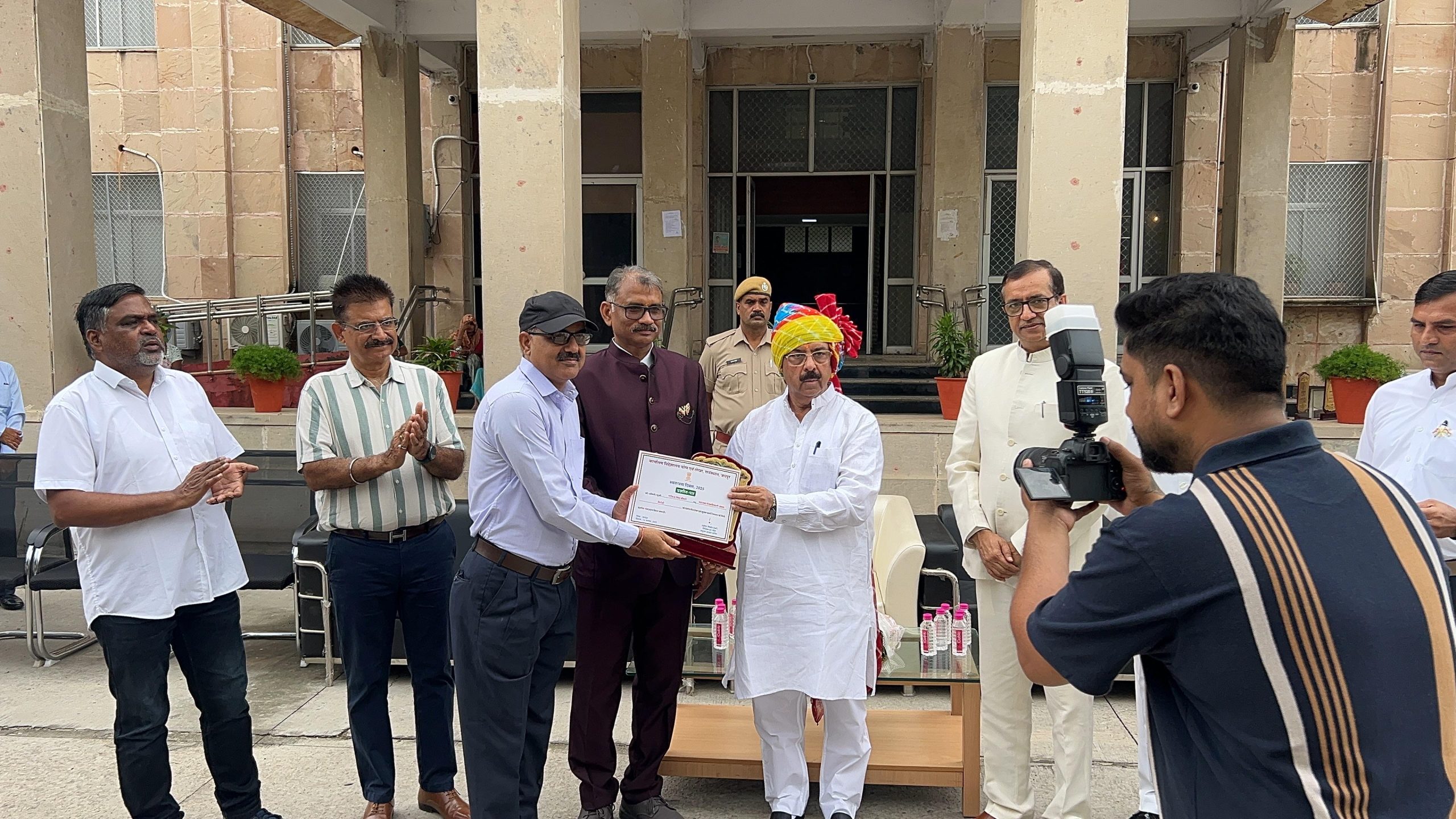 वित भवन जयपुर में स्वाधीनता दिवस के कार्यक्रम में राज्य वित आयोग के अध्यक्ष श्री अरुण जी चौधरी ने उप कोष कार्यालय के लेखा शाखा के गोविन्द सिंह चौधरी की उत्कृष्ट सेवा के लिए सम्मान किया जिस पर राजस्थान शिक्षक संघ के सदस्यों ने उनका बहुमान माला साफा वो शाल द्वारा बहुमान किया और कार्यालय में उनकी सेवा की सराहना की इस अवसर पर लक्ष्मीनारायण खंडेलवाल,सेवानिवृत। शिक्षक जसवंत सिंह भेराराम कुम्हार सुखराज खंडेलवाल दिनेश पुरोहित भरता राम ग्रासिया वी सेवानिवृत प्रधानाचार्य रमेश खंडेलवाल उपस्थित थे ।