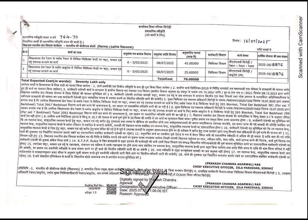 इन खरीद प्रस्तावों को जिला परिषद सिरोही के मुख्य कार्यकारी अधिकारी प्रकाशचंद्र अग्रवाल द्वारा प्रशासनिक व वित्तीय स्वीकृति दी गई, जिसके बाद सीएमएचओ कार्यालय की ओर से कुल 70 लाख रुपए की सामग्री खरीद की गई।
