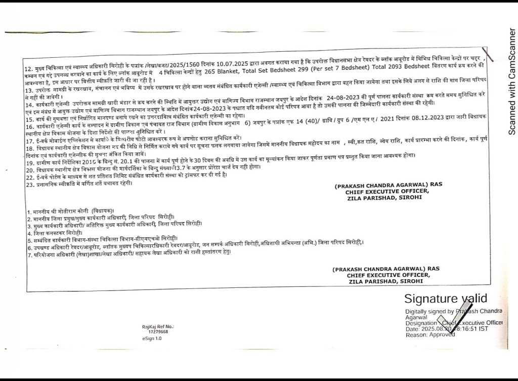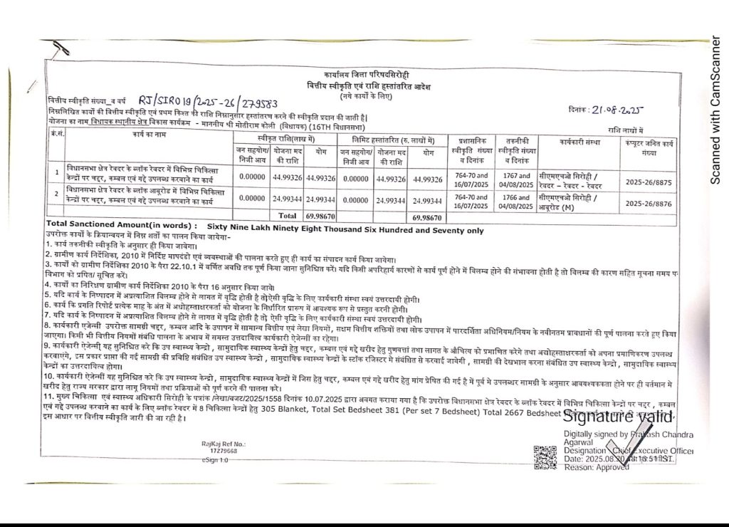 खत्री ने पत्र में उल्लेख किया कि रेवदर विधानसभा क्षेत्र से कांग्रेस विधायक मोतीलाल कोली द्वारा विधायक कोष से रेवदर व आबूरोड ब्लॉक के विभिन्न चिकित्सा केंद्रों में बेडशीट, कंबल व गद्दों की खरीद के लिए कुल 70 लाख रुपए की अनुशंसा की गई। इस कार्य के लिए कार्यकारी संस्था के रूप में सीएमएचओ सिरोही को नामित किया गया।